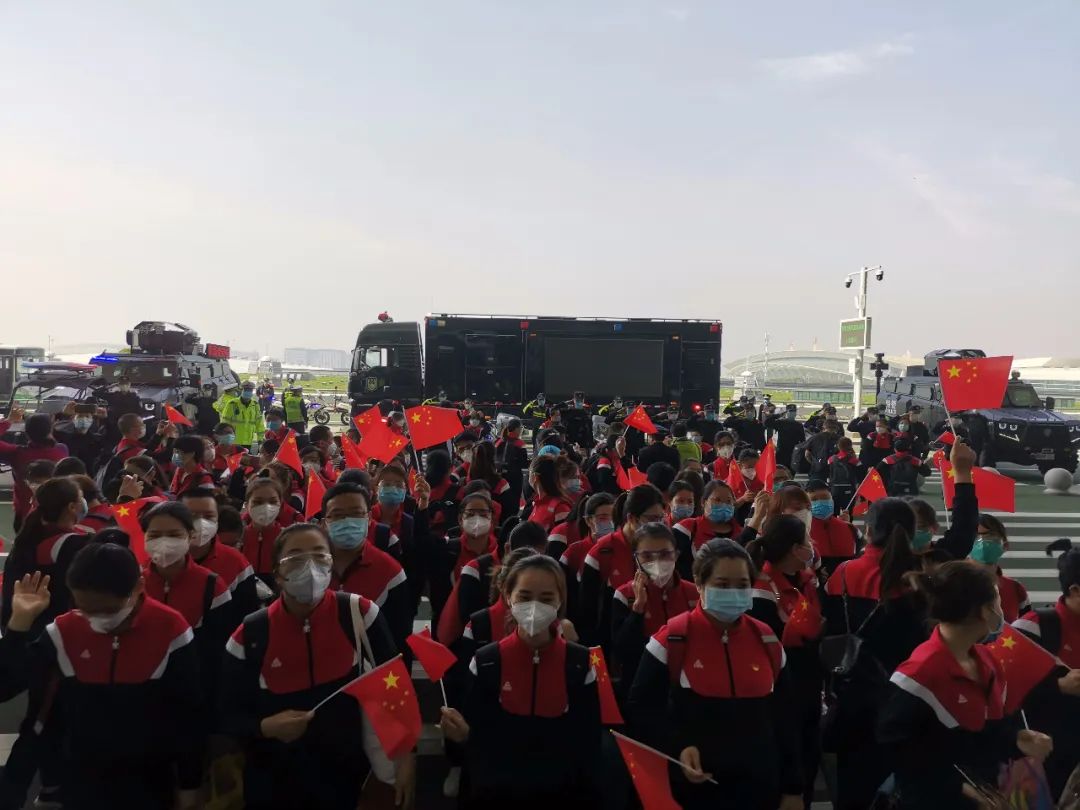 準備凱旋的海南國家緊急醫學救援隊高喊“武漢加油,中國加油!”