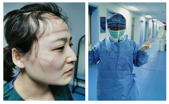 第一次下班后看到臉上被勒出來了深深的痕印,第一次從紅區出來的時候止不住想要嘔吐,摸著臉上的“溝壑”,我偷偷地流了淚,當時心想:我這是要毀容了嗎?可是我還沒有男朋友呢……