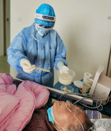 我所在的湖北婦幼保健院光谷院區感染二科是重癥科室,病人基本都是生活不能自理的老奶奶、老爺爺。除了日常的護理工作---輸液、動靜脈采血、插胃管、導尿管、檢測呼吸機、搶救病人、病房的洗消、垃圾的處理外,還要喂飯、喂藥,換尿不濕。因為語言不通(老人家說武漢方言),還要連說帶比劃,半天才能搞明白爺爺奶奶們想要表達的意思。一個班下來,渾身都是汗快要累癱了,但是耳邊老爺爺老奶奶的話語,“孩子,謝謝你”,那時候我的心里倍感欣慰,感覺渾身都是勁。