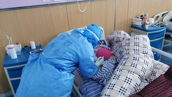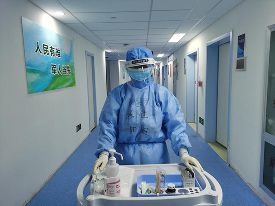到武漢我被分配在湖北省婦幼保健院光谷院區感染二科,這是一個危重病區,收治的大部分都是老年患者。剛到武漢的第二天,我護理一位耄耋之年的老爺爺,在打針時,他隨口說了一句有沒有凳子,站著吃飯很費力。打完針,我就急忙給他找了個凳子送過去。老爺爺說自己是個退伍老兵,說完鄭重其事地站起來向我敬了一個軍禮。那一刻,我不由自主地站直了身子,握緊了右拳,心中默念:“加油!”那一刻,我覺得我全身每一顆細胞都熱血沸騰!