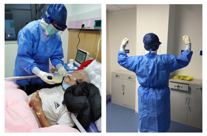 記得剛開始穿防護服進病房,小伙伴們緊張害怕,緊張自己的防護服是否嚴密包裹自己,是否有任何暴露的風險。害怕的是,因為是第一次接收病人,能否合理安排好工作秩序,能否可以和病人順利交流等諸多問題。隨著時間的推移,在摸索中一步步前進,轉眼間,一個月快過去了,我們已經適應了穿防護服的日子,適應了每天過的跟打仗似的日子。