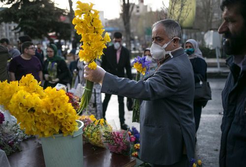 3月19日,有伊朗民眾戴著口罩在挑選鮮花,準備慶祝節日。新華社發
