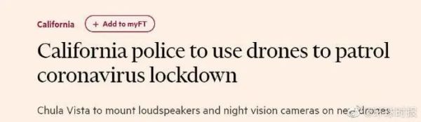 據英國《金融時報》20日報道,美國加州警察局計劃將使用配備揚聲器和攝像頭的無人機進行美國新冠疫情“居家隔離”時期的巡查防疫工作。