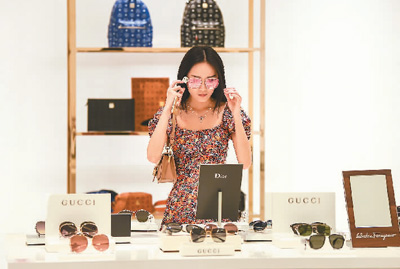 近日,海南三亞國際免稅城在海南三亞市增開了兩家免稅體驗店。顧客可在免稅體驗店內體驗商品后,在網上下單購買。圖為一名顧客在新開于三亞紅樹林度假酒店內的免稅體驗店體驗商品。