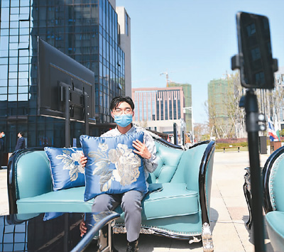 在江西省贛州市南康區跨境電商產業園,銷售員工通過手機直播的形式推銷家具。