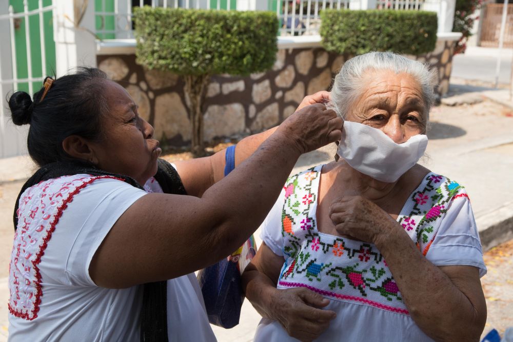 4月15日,在墨西哥梅里達市斯昆亞村,當地瑪雅土著居民佩戴捐贈的口罩。 新華社發(馬丁·塞蒂納攝)