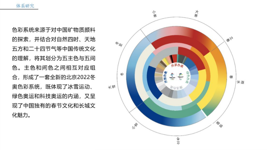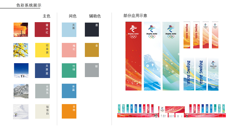 經過對中國歷史上代表性色彩的挖掘,對中國色彩文化的提煉以及對北京、延慶和張家口三個賽區城市色彩的分析,設計了北京2022年冬奧會和冬殘奧會色彩系統,