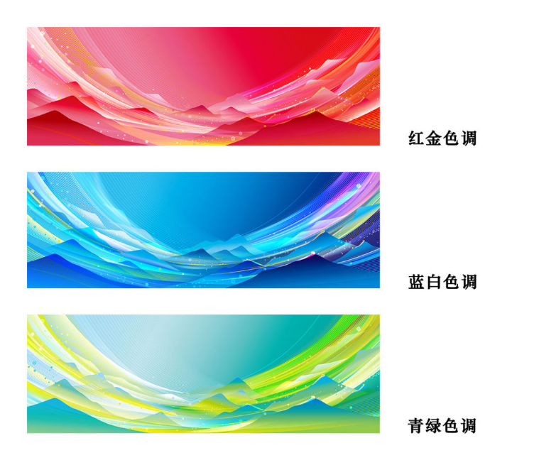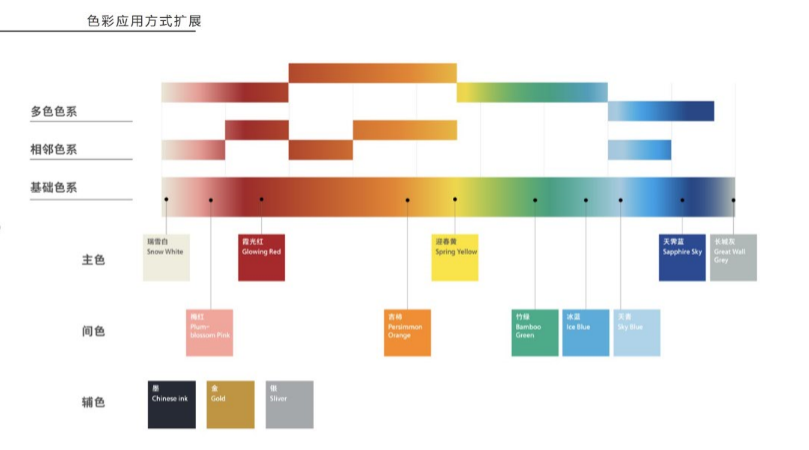 輔助色包括有墨、金、銀。色彩系統通過基礎色系、相鄰色系及多色色系等方式可以形成組合應用。