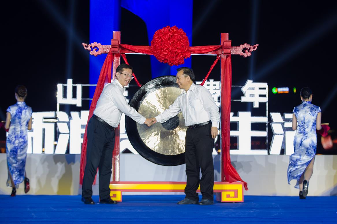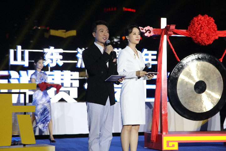 晚上7點半,“山東消費年”在濟南市泉城廣場正式啟動,李干杰省長和蔣希偉副臺長登臺,共同敲響矗立在廣場上的一面銅鑼,寓意“鳴鑼開市”。鑼聲莊重洪亮,象征著生意興旺,國富民強。
