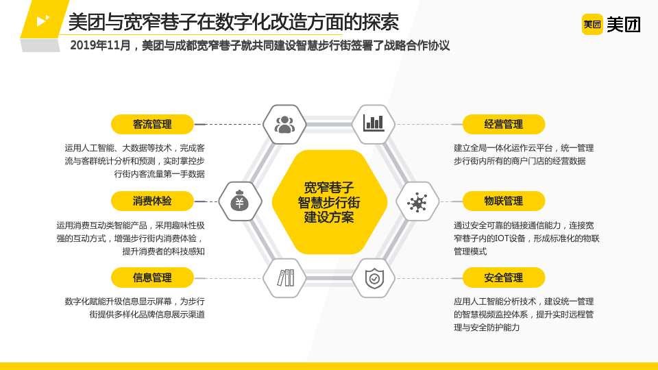 美團(tuán)與寬窄巷子合作改變了運(yùn)營管理團(tuán)隊(duì)在精準(zhǔn)掌握步行街客流、交易用戶及經(jīng)營管理等方面較為傳統(tǒng)的局面,為寬窄巷子提供了“全場(chǎng)景引流+新消費(fèi)體驗(yàn)+智慧化管理”三位一體的數(shù)字化解決方案:在線下,通過在街區(qū)建設(shè)智慧商圈大屏、部署智慧攝像頭,為商戶鋪設(shè)美團(tuán)餐飲系統(tǒng)軟硬件設(shè)備等舉措,寬窄巷子運(yùn)營管理團(tuán)隊(duì)能實(shí)時(shí)查看步行街內(nèi)客流和消費(fèi)動(dòng)態(tài),當(dāng)發(fā)生客流過密等異常情況,會(huì)及時(shí)收到報(bào)警,進(jìn)而在疫情防控常態(tài)化下有效防范風(fēng)險(xiǎn),極大地提升了管理效率。在線上,美團(tuán)、大眾點(diǎn)評(píng)等App展示了“寬窄巷子”品牌館,通過“到店套餐”“代金券”“買單”等活動(dòng)為街區(qū)帶來更多關(guān)注和交易。