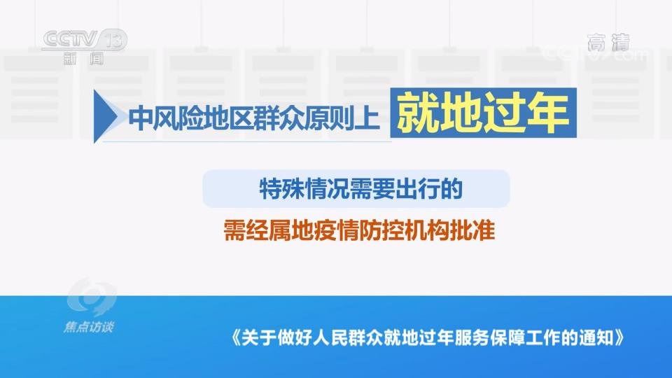 近日,中共中央辦公廳、國務院辦公廳印發了《關于做好人民群眾就地過年服務保障工作的通知》,明確了春節期間要合理有序引導群眾就地過年。就地過年政策是分級分類的:其中,疫情高風險地區群眾均應就地過年,把人員流動降到最低,防止因人員流動導致疫情傳播擴散。中風險地區群眾原則上就地過年,特殊情況需要出行的,需經屬地疫情防控機構批準。低風險地區倡導群眾就地過年,非必要不出行。機關、事業單位和國有企業人員要帶頭就地過年,引導外地農民工、尚未離校的師生就地過年,確需出行人員原則上不前往中高風險地區。