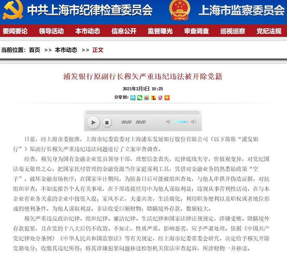 據(jù)上海市紀(jì)委監(jiān)委消息:日前,經(jīng)上海市委批準(zhǔn),上海市紀(jì)委監(jiān)委對上海浦東發(fā)展銀行股份有限公司(以下簡稱“浦發(fā)銀行”)原副行長穆矢嚴(yán)重違紀(jì)違法問題進(jìn)行了立案審查調(diào)查。