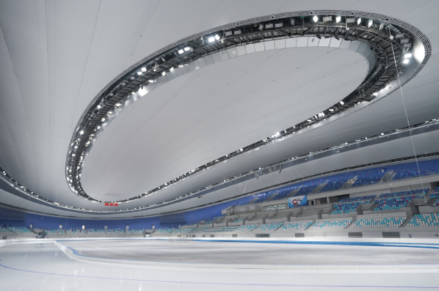 新建的國家速滑館,是北京主賽區標志性場館,也是唯一新建的冰上競賽場館,被形象地稱為“冰絲帶”。國家速滑館利用2008年奧運會曲棍球和射箭的臨時場地進行建設,擁有亞洲最大的全冰面設計,冰面面積達1.2萬平方米。