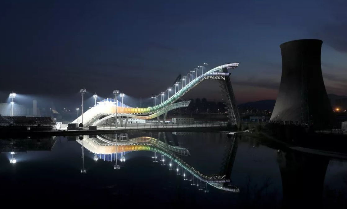 國家跳臺滑雪中心是我國首座符合國際標準的跳臺滑雪場地,也是張家口主辦區工程量最大、技術難度最高的競賽場館,將承擔冬奧會跳臺滑雪、北歐兩項的比賽。跳臺剖面因與中國傳統吉祥物“如意”的S形曲線契合,因此被形象地稱為“雪如意”。國家跳臺滑雪中心由位于山頂的頂峰俱樂部和位于山下的看臺區和兩條賽道組成,兩條賽道分別由落差136.2米的大跳臺賽道和落差114.7米的標準跳臺賽道組成。
