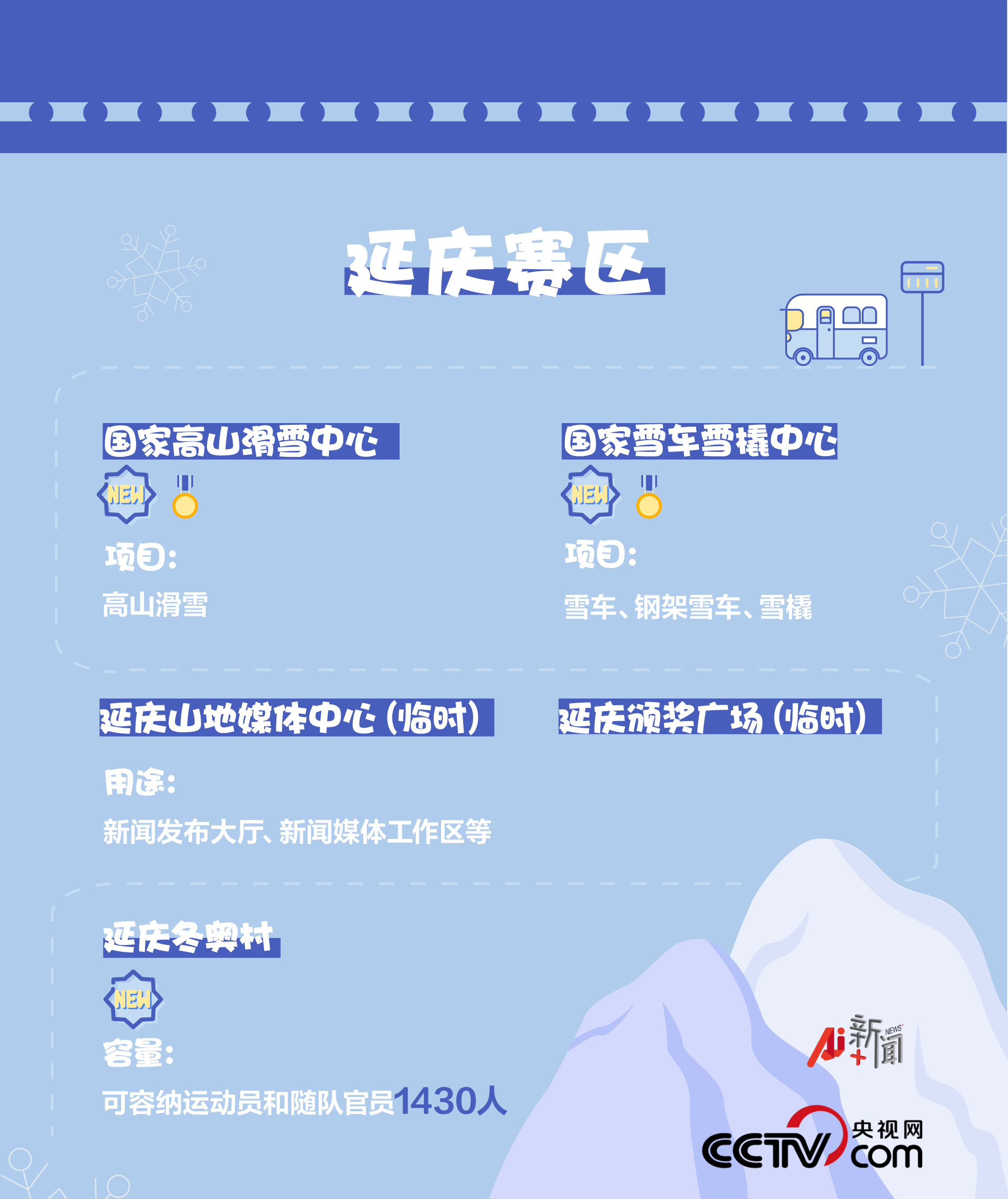 延慶賽區位于北京中心城的西北方向的延慶區,共有5個競賽和非競賽場館,其中3個為新建場館、2個為臨時場館,將進行3個大項(高山滑雪、雪車、雪橇)、4個分項(高山滑雪、雪車、鋼架雪車、雪橇)、20個小項的比賽。
