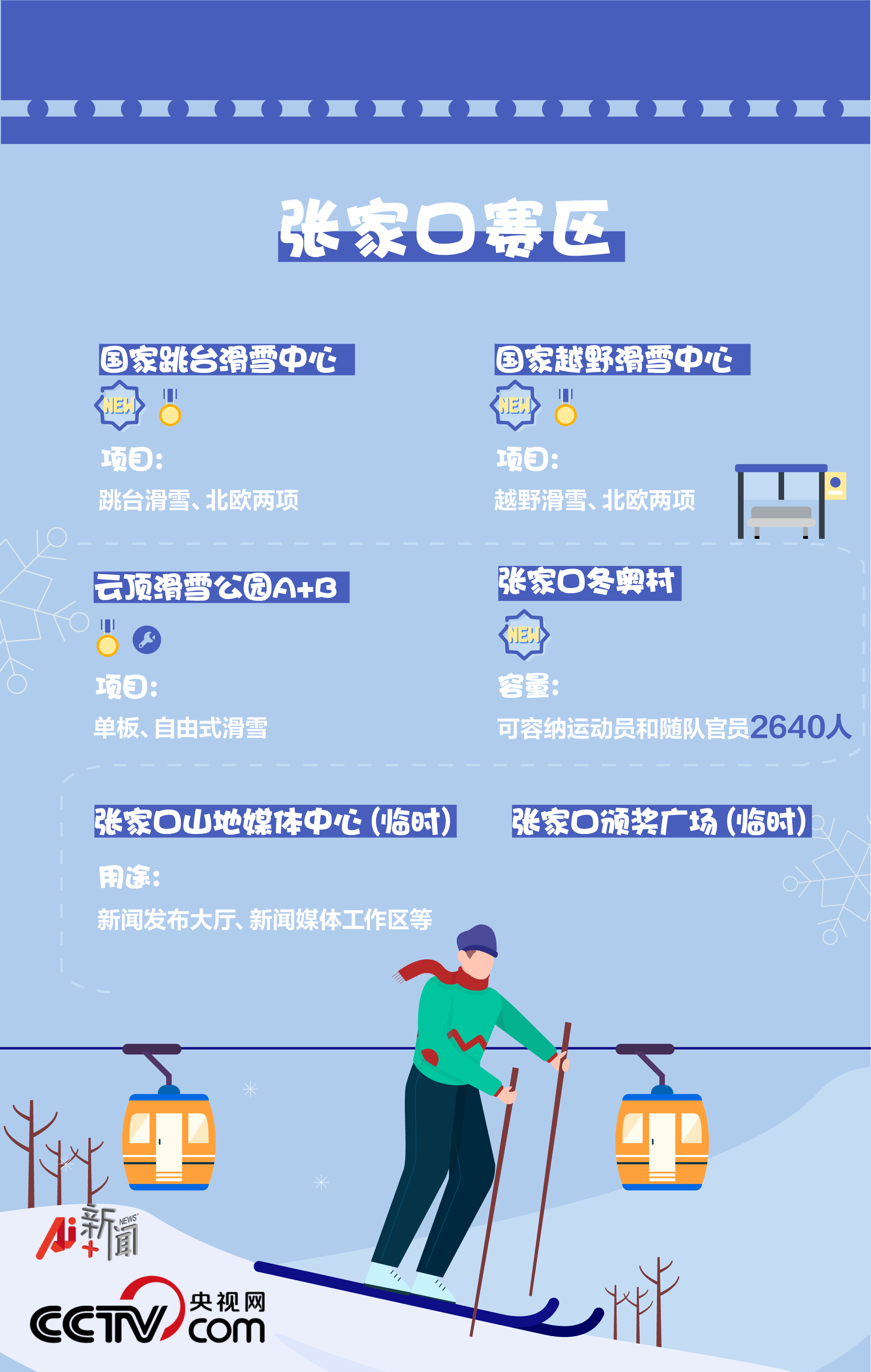 張家口賽區位于河北省張家口市崇禮區,共有7個競賽和非競賽場館,其中4個為新建場館、1個為現有場館、2個為臨時場館,將進行2個大項(滑雪、冬季兩項)、6個分項(冬季兩項、越野滑雪、跳臺滑雪、北歐兩項、自由式滑雪和單板滑雪)、51個小項的比賽。