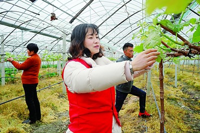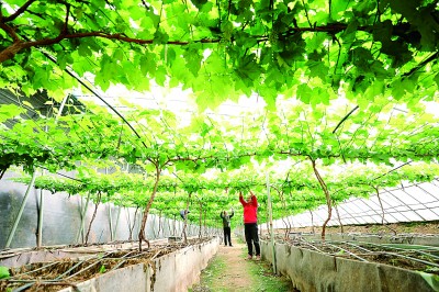 農戶在河北省巨鹿縣西郭城鎮南鹽池村果蔬大棚管護葡萄。胡良川攝/光明圖片