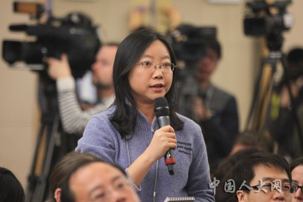 3月11日上午,十二屆全國人大二次會議在梅地亞中心舉行記者會,中國人民銀行行長周小川等五位嘉賓就“金融改革與發展”的相關問題回答中外記者的提問。圖為中國日報、中國日報網記者提問。羅榮 攝