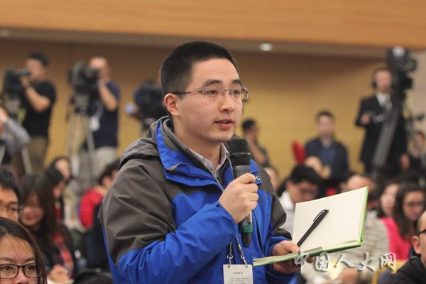 3月11日上午,十二屆全國人大二次會議在梅地亞中心舉行記者會,中國人民銀行行長周小川等五位嘉賓就“金融改革與發展”的相關問題回答中外記者的提問。圖為中國互聯網中心、中國網記者提問。羅榮 攝