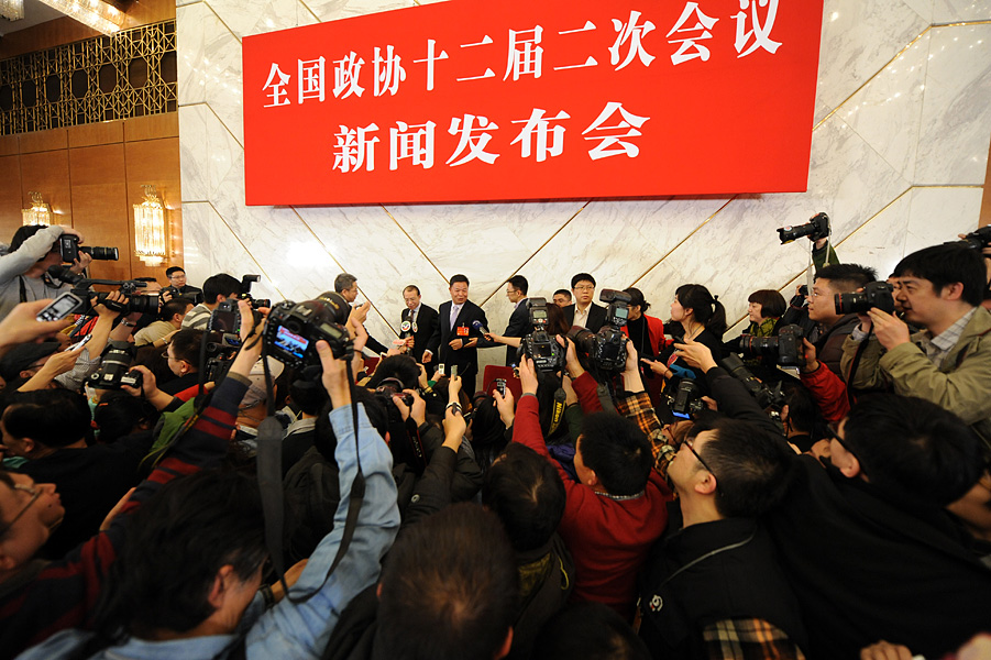 3月2日,全國(guó)政協(xié)十二屆二次會(huì)議新聞發(fā)布會(huì)在人民大會(huì)堂一層新聞發(fā)布廳舉,圖為發(fā)布會(huì)結(jié)束后,記者圍堵采訪呂新華。新華網(wǎng)/中國(guó)政府網(wǎng) 陳競(jìng)超 攝