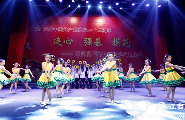央廣網都昌7月1日消息(傅建斌)為慶祝中國共產黨成立九十三周年,6月30日晚,江西省九江市都昌縣舉行紀念中國共產黨成立93周年表彰文藝晚會。各群眾文藝團隊以飽滿的熱情,用歌舞、竹板、漁歌等藝術形式慶祝黨的生日。