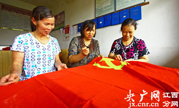 央廣網撫州7月1日消息(撫州臺謝慧星 徐維棟)“七一”建黨節前夕,廣昌縣甘竹鎮甘竹村女黨員干部自發組織起來,用針線繡一面鮮艷的黨旗獻給村黨支部。