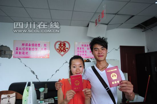 4月26日上午,小倆口跑到雅安市區照了相回來,當天下午就鉆進了蘆山縣民政局所在的帳篷。下午下班之前,兩人終于取到了結婚證,笑得合不攏嘴。在蘆山縣民政局供新人合照的紀念墻前,一條V字形的裂紋刻進了兩人的相片。