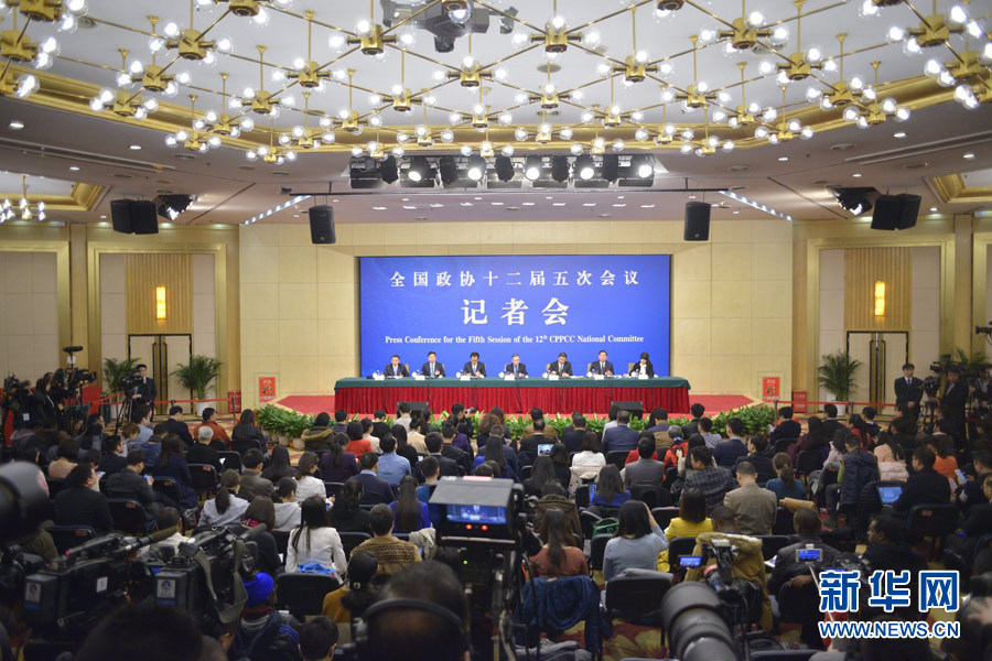 3月9日,全國政協十二屆五次會議舉行記者會,邀請5位全國政協委員圍繞保障和改善民生的重點任務,就精準扶貧精準脫貧、提高醫療公共服務水平、以創業帶動就業、推進養老服務、持續加強節能環保和生態建設等回答記者提問。圖為記者會現場。新華網/中國政府網 傅義洲 攝