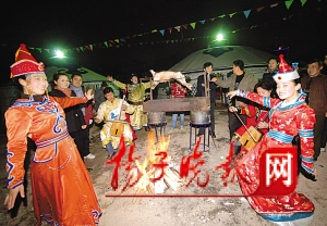 天色暗了下來,蒙古包前擺上“馬尼紅”祭壇,燒起篝火,圍著篝火,伴著琴聲,來自內(nèi)蒙古草原的阿巴和同伴們唱阿跳埃他們還特別為記者表演了獨(dú)特的禮節(jié),向客人奉上哈達(dá),倒上奶酒,端上烤全羊。在這樣溫暖的情調(diào)中,王慶玲在客人的邀請下,用蒙語唱起了《祝酒歌》,其開闊的音域,純正的蒙語口音,把蒙族主人也震驚了。(吳勝 陳廣宏 梅建明)