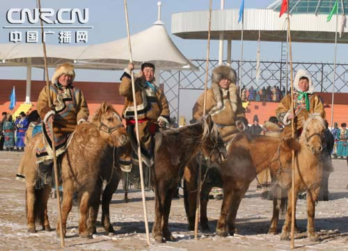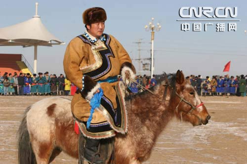 中廣網呼和浩特1月30日消息(記者阿都欽)蒙古族被稱為“馬背民族”,歷史形成以馬文化為主要內容的傳統。日前,在內蒙古東烏珠穆沁旗烏里雅斯太鎮舉行的第四屆“吉祥 烏珠穆沁”草原冰雪那達慕期間,“馬背文化”再次得到彰顯。10公里速度賽馬、馬上拾哈達、中蒙業余馬頭琴邀請賽等活動,將這里的冬季那達慕推向高潮。