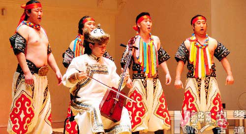 11月8日,在英國(guó)首都倫敦市中心的卡多根劇場(chǎng),中國(guó)內(nèi)蒙古民族歌舞劇團(tuán)青年合唱團(tuán)演員為觀眾表演傳統(tǒng)節(jié)目。當(dāng)天,30名合唱團(tuán)演員深情演繹了蒙古族民歌《圣主成吉思汗》、《四海》、《雁》、《駝鈴》和《蒙古靴》等作品。長(zhǎng)調(diào)、馬頭琴和呼麥號(hào)稱蒙古族音樂的三大特色,其中前兩者已被聯(lián)合國(guó)教科文組織列為人類非物質(zhì)文化遺產(chǎn),這些在當(dāng)晚的演出中一一得到展現(xiàn)。 新華社記者馬建國(guó)攝