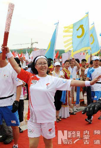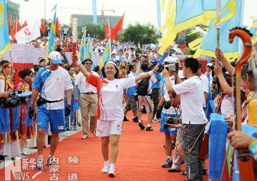 7月10日,最后一棒火炬手斯琴高娃高舉火炬。當日,北京奧運圣火在內蒙古自治區赤峰市傳遞。 新華社記者張領攝