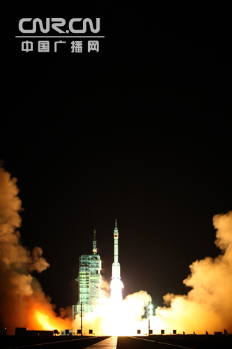 搭載著神舟七號載人飛船的長征二號F遙七運載火箭起飛瞬間(記者南光 曹囡囡 攝)