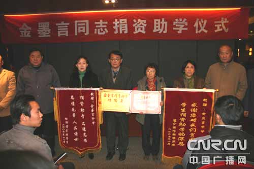 中廣網(wǎng)呼和浩特11月30日消息(記者鄭穎)2007年11月29日上午,內(nèi)蒙古已故副省級(jí)離休干部金墨言同志的子女遵照老人的遺囑,將16.9160萬(wàn)元撫恤金全部捐贈(zèng)給內(nèi)蒙古希望工程。根據(jù)老人子女的要求,內(nèi)蒙古青少年發(fā)展基金會(huì)將用這筆撫恤金資助91名貧困大、中、小學(xué)生。金墨言同志捐贈(zèng)的撫恤金,是2007年內(nèi)蒙古青少年發(fā)展基金會(huì)收到的最大一筆個(gè)人捐款。