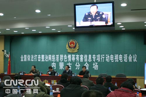 中廣網呼和浩特1月23日消息(記者鄭穎)1月22日,內蒙古自治區依法打擊網絡淫穢色情等有害信息專項行動電視電話會議在呼和浩特市舉行,就2008年內蒙古依法打擊整治網絡有害信息專項行動進行了全面部署。