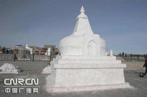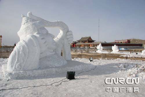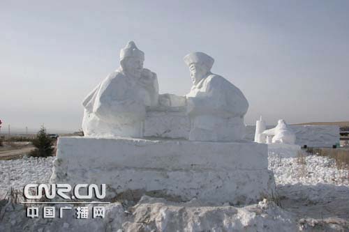 雪雕:掰手腕 中廣網呼和浩特2月3日消息 (記者阿都欽)入冬之后,內蒙古東烏珠穆沁旗所在地烏里雅斯太鎮的庫倫廟廣場成為城鎮居民、牧民群眾喜愛的休閑場所。這里具有濃厚民族風情的雪雕展將這座嚴冬中的邊陲小鎮裝扮的更加靚麗。