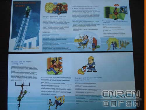 滿洲里市消防特勤大隊(duì)印制的俄文版消防宣傳單內(nèi)容包括如何報(bào)火警、火場逃生、滅火器使用方法和防火常識等消防安全知識。在宣傳單上還配有消防宣傳漫畫,做到了圖文并茂,很受俄羅斯游客的喜愛。主要通過組織官兵直接向俄羅斯人發(fā)放和在俄羅斯人較為集中的賓館、飯店、西餐廳、商場、市場的醒目位置放置“俄文消防宣傳單”兩個(gè)渠道向俄羅斯入境人員宣傳消防知識,達(dá)到了消防宣傳的作用和目的,到目前“俄文消防宣傳單”已發(fā)放5000余份。