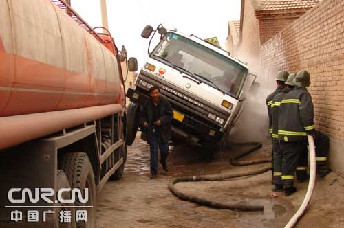 中廣網呼和浩特4月5日消息(記者鄭穎 通訊員仲高錦)4月3日15時32分內蒙古阿拉善盟阿左旗消防中隊接到報警,巴彥浩特鎮民族中學家屬區一油罐車傾翻,發生嚴重泄漏,車內載有5噸90﹟汽油,時刻有發生爆炸的危險,嚴重影響到周圍幾百戶居民的生命財產安全。接到報警,阿左旗中隊迅速出動1輛泡沫車、1輛水罐車、1輛后援車,14名官兵在5分鐘內趕到現場,并立刻展開戰斗。