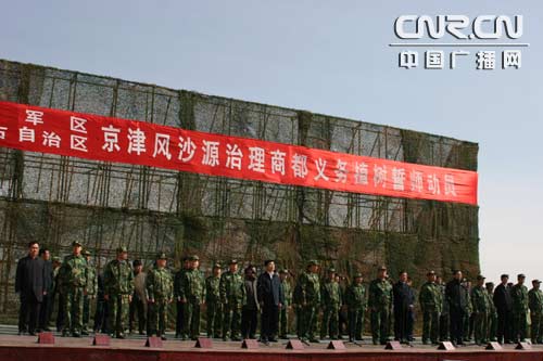 中廣網呼和浩特4月26日消息(記者文偉 內蒙古臺杜少俊 烏蘭察布臺護群)北京軍區、內蒙古軍區京津風沙源治理商都義務植樹誓師動員大會26日上午在商都縣七臺鎮舉行。誓師動員大會現場,彩旗飄揚。北京軍區、內蒙古軍區6000名官兵和商都縣干部職工、民兵、預備役、學生共1萬多人參加誓師動員大會。