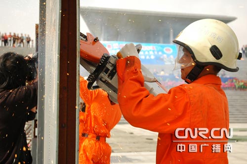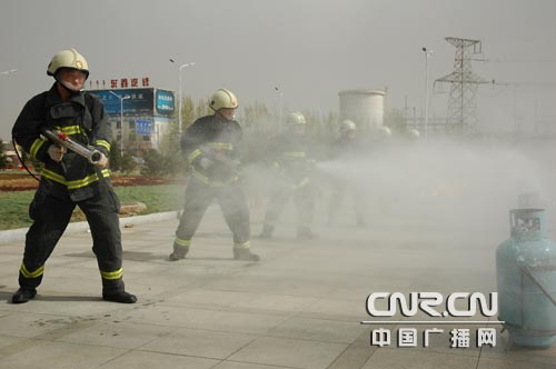 在隨后進行的崗位練兵及滅火演習中,消防官兵表演了佩戴空氣呼吸器、穿著消防戰斗服、氣壓脈沖噴霧水槍滅火、動力圓盤鋸和鏈鋸破門、體能訓練、油料火撲救等精彩項目,不但贏得了臺上領導的陣陣掌聲,也使前來觀看的群眾大開眼界。