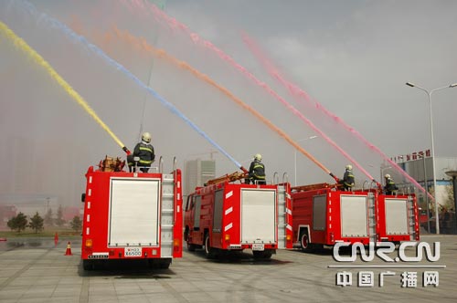 演練結束后,顏炳強局長在有關領導的陪同下,參觀了廣場四周展示的各種先進消防裝備,親切慰問了消防官兵,并認真聽取了他們對所操作裝備的講解。展示的裝備包括通信指揮車、消防水罐車、高噴消防車、云梯消防車、高架平臺消防車、設備檢修車、伙食保障車,以及新裝備的消防坦克。