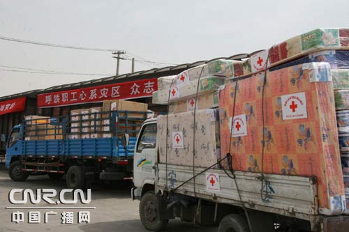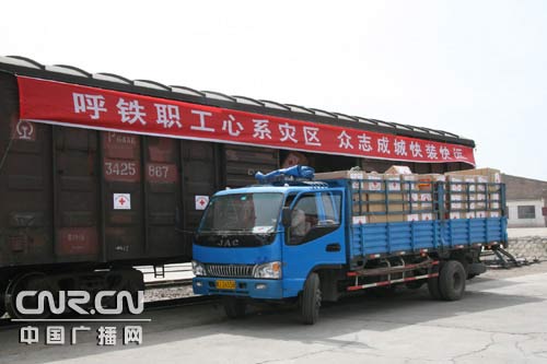 中廣網(wǎng)呼和浩特5月21日消息(記者那森寶音 攝影馬立峰)內蒙古首批支援甘肅地震災區(qū)救援物資專列今天上午十時半啟運,開往甘肅天水。救援物資包括2萬件衣物、1057萬套棉被。
