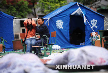 5月15日,木魚中學(xué)學(xué)生白妤蔓的父母(前)在女兒的遺體前悲痛萬分。在汶川地震中,四川省青川縣木魚中學(xué)275名學(xué)生死亡,30名學(xué)生下落不明。 新華社記者 陶明攝