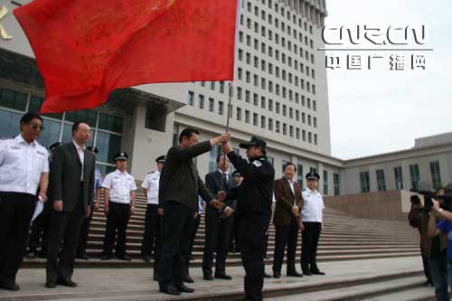 自治區(qū)副主席連輯為救援隊授旗 內(nèi)蒙古自治區(qū)副主席任亞平:“同志們,內(nèi)蒙古自治區(qū)呼市公安局第二批赴四川災區(qū)抗震救災突擊隊現(xiàn)在出發(fā)。”