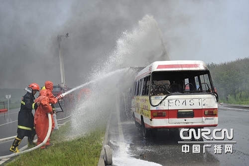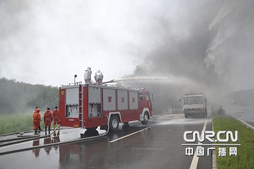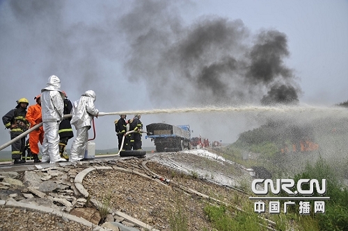 演習模擬了這樣的場景:一輛由西向東違章逆向行駛的小轎車,與迎面行駛的大貨車相撞,小轎車內兩人被困,一人頭部受傷,一人左臂骨折,等待救援。隨后,一輛中型客車和另外一輛小轎車躲閃不及相繼追尾,造成4輛車連環相撞,中型客車內有20余人被困;其余人員自救逃生。9點45分,所有增援部隊全部集結到場,一場集處置化學危險品泄漏、油罐爆炸、人員被困、草原、森林火災于一體的多行業、跨區域災害救援行動在現場展開。所有參加演習的人員冒著油罐隨時爆炸的危險,頂著火焰的灼烤,解救被困群眾、 處置化學危險品泄漏、設置水幕、切斷泄漏源,一氣呵成,干凈利落。10點,肆虐的火魔很快被裝備精良、訓練有素的專業人員成功化解,受困人員被成功解救,演練圓滿結束。