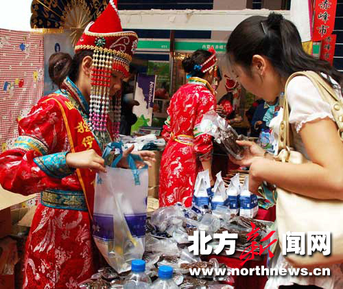 內(nèi)蒙古展區(qū)的工作人員身著蒙古族服飾