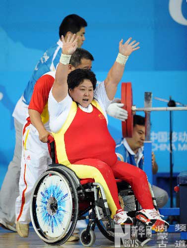 9月14日,中國選手李瑞芳試舉成功后向觀眾揮手致意。當日,在北京2008年殘奧會女子82.5公斤以上級舉重比賽中,中國選手李瑞芳以165.0公斤的成績奪得冠軍。 新華社記者楊磊攝
