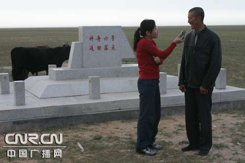 記者在神舟六號飛船主著陸場阿木古郎畜群點采訪邊民張存貴老人時,老人激動地說:“神舟六號飛船回收艙在我家草場著陸,這是中國人民的驕傲,也是我們全家人的驕傲;今年盼望著神舟七號也在這里著陸。為此,我已經準備好了五星紅旗和”歡迎回家“的標語,和周圍群眾共慶和見證這一偉大的時刻的到來。”