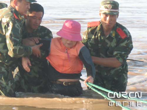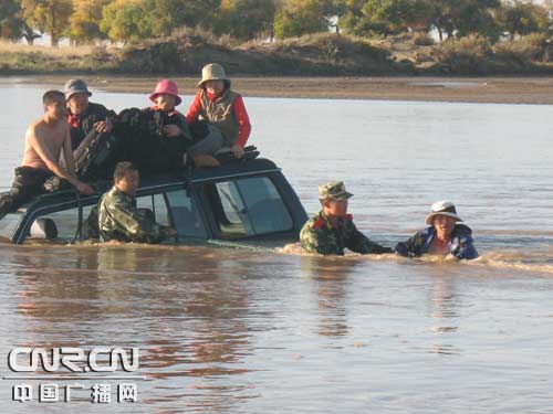 當日16時36分,額濟納旗邊防大隊接到報警稱:一輛越野車在距達來庫布鎮西南方向20公里的漫水橋被河水沖下橋面,車內5人被困,情況危急,請求救援。接警后,邊防大隊立即啟動處置突發事件預案,11名官兵攜帶繩索、鐵鍬等救援工具,兵分兩路火速趕赴漫水橋。事發現場,百余名游客及過往群眾站在河水兩岸焦急而又無奈地向河中心張望、呼喊。一輛越野車被湍急的河水沖下橋面,距河岸150多米遠,河水已漫至車窗上沿,5名乘客坐在越野車頂部瑟瑟發抖,等待救援。由于近日額濟納旗境內降雨量增大,漫水橋河面水位暴漲,水流湍急,越野車隨著水浪左右搖擺,隨時有被掀翻的危險,5名游客的生命岌岌可危。救援人員兵分兩組,身材較為高大的一組將繩索系住腰部,手挽手下河救援;另一組緊緊拉住繩索,確保救援官兵和被救群眾的安全。由于驚嚇過度兩名女游客,蜷縮在越野車頂部,驚恐地看著河水,不肯配合救援。經過救助官兵在冰冷的河水中耐心勸導,兩名女游客最終才接受救助。經過一個小時的緊急救援,5名被困人員在河水漫過車頂之前全部被安全救出。經了解,5名受困人員中4名是來額濟納旗旅游的韓國人,駕駛員系呼和浩特市某旅游局職工。5人在怪樹林拍照返回途中,由于駕駛員對漫水橋面情況不熟悉、對水勢估計不足,導致車輛被河水沖下橋面,險些釀成車毀人亡的慘劇。