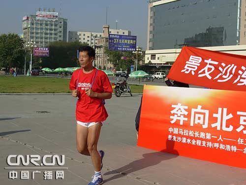 中廣網呼和浩特10月14日消息(記者那森寶音、任艷君) 被譽為“中國民間馬拉松長跑第一人”的呼和浩特市市民任衛東,13日啟程前往首都參加2008北京國際馬拉松賽。與以往不同的是,此次前往首都任衛東要用五天的時間從呼和浩特跑到北京(全程467公里)。